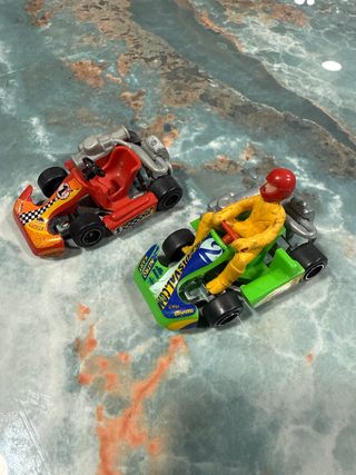 Dos coches de carreras de juguete de la marca Guisval. - años 80. - Coche rojo con detalles en naranja y negro. - Coche verde con piloto amarillo y detalles en azul.