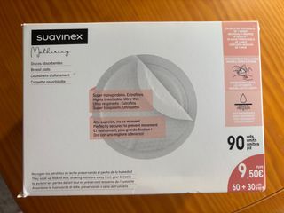 Caja de discos absorbentes de la marca Suavinex, modelo Mathering. Son ideales para absorber la leche y mantener la piel seca. - 90 unidades. - Empaquetados individualmente. - Ultra transpirables y finos. - Perfectamente fijados para evitar movimiento. - Muy absorbentes.