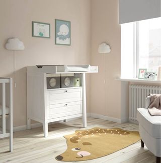 Mueble cambiador de IKEA en color blanco. Cuenta con dos cajones y una superficie superior abatible para el cambio de pañal. - Diseño clásico y funcional. - Dos cajones con tiradores negros. - Superficie superior con bordes de seguridad.