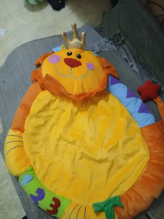 Manta de juego suave y colorida con diseño de león. Ideal para que los más pequeños exploren y se diviertan. - Diseño de león con corona dorada. - Colores vibrantes: amarillo, naranja, azul y verde. - Incluye elementos de diferentes texturas y números.