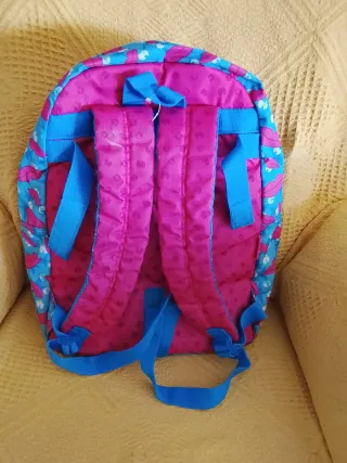 Mochila escolar con un divertido diseño. - Estampado de labios y estrellas en tonos rosa y azul. - Mensaje Always show your best smile en la parte frontal. - Bolsillo exterior con cremallera.