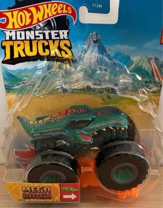 NUEVO DE TIENDA. Camión monstruo Hot Wheels Mega Wrex. - Diseño inspirado en un dinosaurio. - Ruedas grandes y robustas.