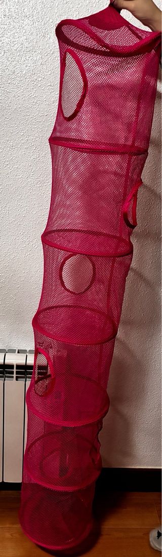 Práctica red de malla para guardar juguetes. Es de color rosa, tiene seis alturas. - Material: Malla. - Color: Rosa. - Diseño: Cilindro con aberturas.
