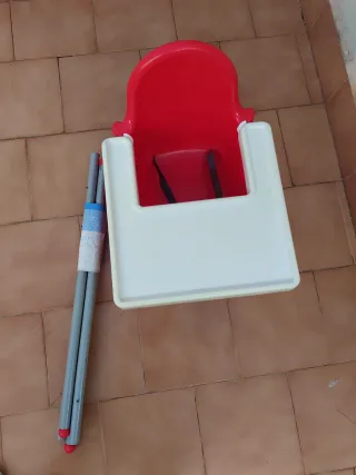 Trona de la marca Ikea, ideal para los más pequeños. Su diseño combina el color rojo del respaldo con una bandeja blanca. - Respaldo de color rojo. - Bandeja de color blanco.