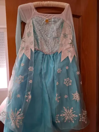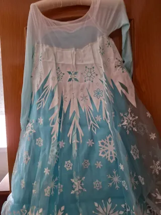 Disfraz inspirado en Elsa de Frozen, perfecto para fiestas o juegos. - Diseño de manga larga. - Cuerpo con detalles brillantes y plateados. - Falda vaporosa en tono azul. - Capa con estampado de copos de nieve.