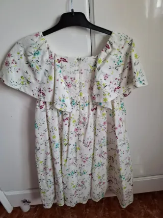 Vestido de niña con estampado floral. - Diseño con volantes en los hombros. - Cuerpo fruncido. - Estampado de flores en tonos pastel y verdes.