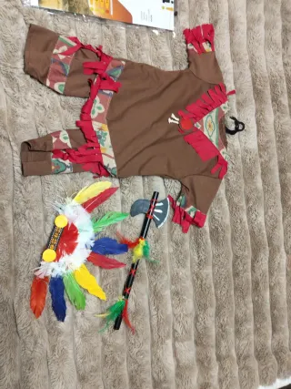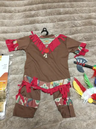 Disfraz de indio para niños en talla 3/4. Incluye varios accesorios para completar el look. - Túnica marrón con detalles de tela estampada y flecos rojos. - Diadema con plumas de colores. - Hacha de juguete con plumas.