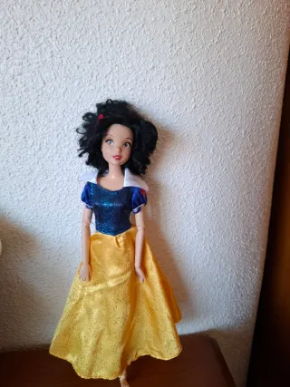 Muñeca de Blancanieves con su icónico vestido. - Vestido azul brillante y falda amarilla. - Detalle de cuello blanco. - Pelo negro rizado.