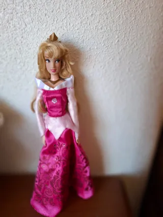 Muñeca de la Princesa Aurora, personaje de Disney. - Vestido rosa y blanco. - Corona dorada. - Pelo rubio largo.
