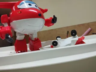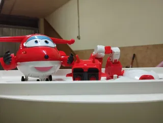Figura transformable del avión Super Wings. - Diseño inspirado en la serie. - Colores rojo y blanco. Con sonido