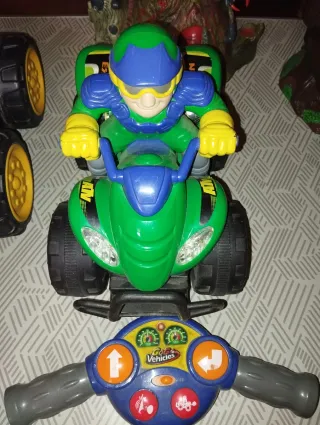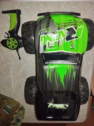 Coche con diseño deportivo y llamativo. - Carrocería con gráficos de Racing Truck. - Ruedas todoterreno. - Mando a distancia incluido.Los coches teledirigidos no sé si funcionan. Se venden por separado