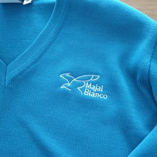 Jersey azul con cuello en V de colegio Majal Blanco Talla ocho Impecable - Diseño liso. - Manga larga. - Logo bordado en el pecho.