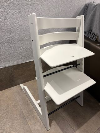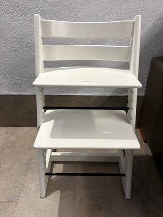 Trona Stokke Tripp Trapp en color blanco, ideal para acompañar el crecimiento de los más pequeños. Se vende con sus complementos: baby set, cojin, bandeja, arnes y new born set. Todo en cajas y bien almacenado. Si os interesa de verdad os envío fotos de todo.