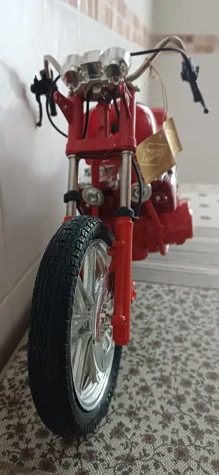 Réplica detallada de una moto en color rojo. - Diseño clásico de moto. - Detalles cromados en el motor y manillar. - Asiento texturizado.