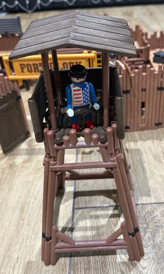 Set de Playmobil Fort Glory con figuras y accesorios. - Incluye fuerte de madera con detalles. - Carruaje con caballos. - Figuras de vaqueros y soldados.
