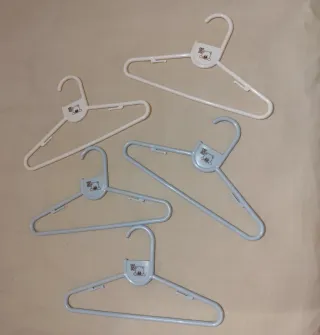 Conjunto de cinco perchas de plástico para ropa de bebé, con un diseño de oso. - Color blanco y azul claro. - Ideales para prendas pequeñas. - Con muescas para tirantes.