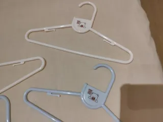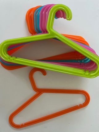 Pack de 19 perchas de plástico para ropa infantil. Son ideales para organizar el armario de los más pequeños. - Colores variados: verde lima, rosa, naranja y azul. - Diseño ligero y resistente.