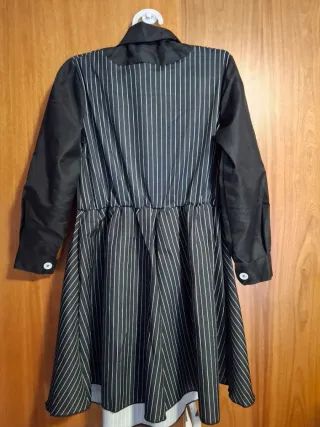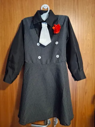 Disfraz de gangster para niña, ideal para fiestas o eventos. - Incluye vestido de rayas blancas con simulacion de camisa negra y corbata blanca. - Detalle de flor roja en la solapa. - No incluye sombrero ni pistola. - Embalaje original. - Como nuevo, usado una sola vez.