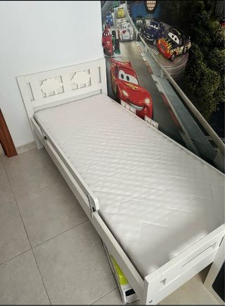 Estructura de cama infantil con con somier y colchón, lista para usar. - Diseño con detalles de nubes en el cabecero. - Estructura de madera. - Colchón blanco de 70X160cm Tal cual se ve en la foto sin barandilla.