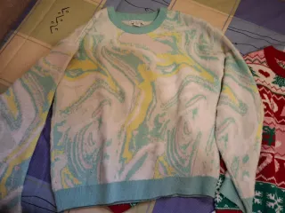 Lote de varias prendas de ropa para niña, talla 9-10 años compuesto por: - Jersey con estampado abstracto en tonos pastel. - Jersey navideño en tonos rosas y rojos con árboles, regalos y copos de nieve. - Chaqueta deportiva con capucha. - Cazadora tejana con estampado de unicornio en la espalda. - Chaqueta color rosa chicle con botones. - Anorak con estampado de topos negros y cremallera. - Vestido de manga corta con la parte superior de camiseta y la parte inferior de faldita con estampado de florecitas.