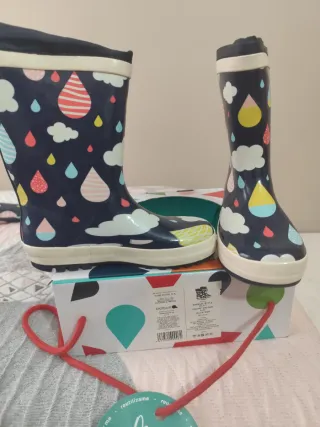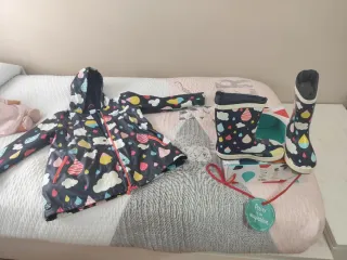 Conjunto de chubasquero y botas de agua de la marca Boboli con un divertido estampado de nubes y gotas de lluvia. - Chubasquero con capucha. - Botas de agua a juego.