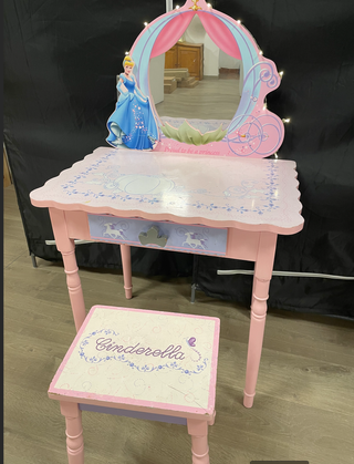 Conjunto de tocador y taburete con temática de la Princesa Cenicienta de Disney. Ideal para los más pequeños. - Diseño en color rosa con detalles de la princesa. - Espejo con marco decorativo. - Taburete a juego con el tocador.
