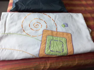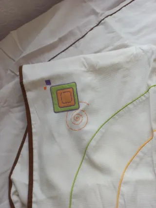 Funda nórdica con un diseño infantil y alegre, perfecta para cama con colchón de 70 x 140 cm. Incluye funda protección laterales. - Estampado con espirales y cuadrados. - Detalles bordados en varios colores. - Aplicación de tela naranja. - Ribete marrón.