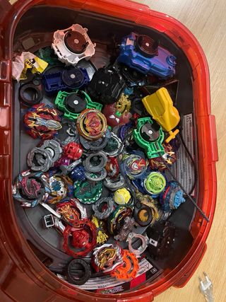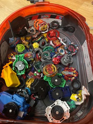 Lote de pista de batalla y varios Beyblades. - Incluye una pista de batalla. - Diversos Beyblades de diferentes colores y diseños. - Lanzadores incluidos.la pista está rota