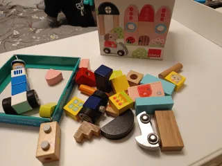 Set de bloques de construcción de madera de la marca Goula. Fomenta la creatividad y el desarrollo de habilidades motoras. - Incluye diversas formas y colores. - Material: Madera. - Ideal para niños. Incluye también bloques para hacer un policía y su coche.