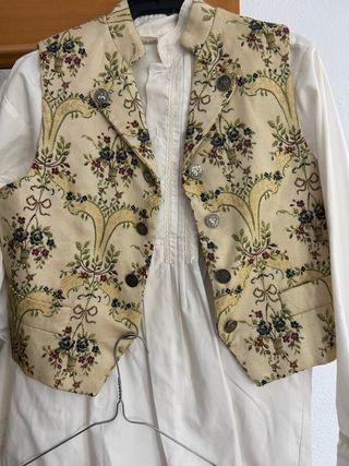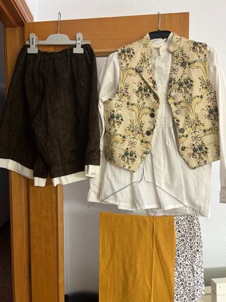 Conjunto completo de traje tradicional Saragüell. - Chaleco estampado floral. - Camisa beige - Pantalón corto marrón. - Pañuelo flores - Fajín ocre Hecho en modista y tiene para sacar talla entre 7 y 10 años
