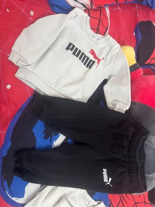 Conjunto deportivo unisex de la marca Puma, ideal para los más pequeños. Incluye sudadera y pantalón. - Sudadera blanca con logo Puma. - Pantalón negro con logo Puma.