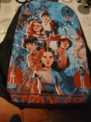 Mochila con diseño de la popular serie Stranger Things. Presenta a los personajes principales de la serie. - Diseño de Stranger Things. - Ilustraciones de los personajes.