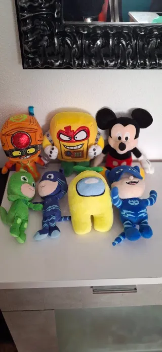 Conjunto de peluches de diferentes personajes. - Peluche de Mickey Mouse. - Peluche de Among Us (amarillo). - Peluches de PJ Masks (Gekko, Catboy, Owlette). - Peluche de Superzings (Kazoom). - Peluche de personaje naranja.