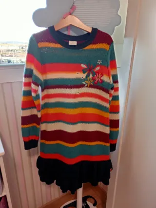 Vestido de lana de la marca Boboli, perfecto para el invierno. - Diseño de rayas multicolor. - Detalle de flores bordadas en el pecho. - Volante en el bajo.