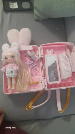Conjunto de ropa y accesorios para muñeca. - Vestido azul con círculos blancos y detalles rosas. - Par de tacones altos rosas y negros. - Gafas de sol rosas. - Bolso transparente con asa rosa. - Lazo o cinta decorativa rosa y negra.