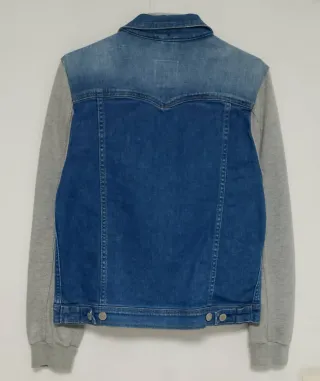 chaqueta vaquera Levi’s tipo Trucker con capucha de sudadera gris Estado: Como nueva (sin marcas de uso ni desperfectos). Corte clásico, bolso delantero con bolsillo de plastrón, botones metálicos originales y capucha cómoda. ✔️ Marca: Levi’s ✔️ Estilo: Vaquera con capucha ✔️ Talla: 14 años ✔️ Color: Denim azul + capucha gris ✔️ Material: denim resistente ✔️ Cierre: botones metálicos