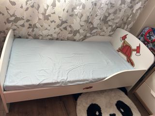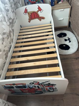 Cama infantil con un divertido diseño de camión de bomberos y casco. - Estructura blanca. - Dibujo de camión de bomberos en el lateral. - Dibujo de casco de bombero y hachas en el cabecero.