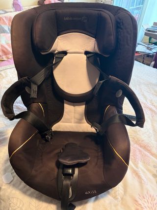 Silla de coche para bebé de la marca Bébé Confort, modelo Axiss. Color marrón oscuro. - Sistema de arnés de 5 puntos. - Reposacabezas ajustable. - Funda extraíble y lavable. - Gira hacia ambos sentidos para orientarla hacia la puerta del coche