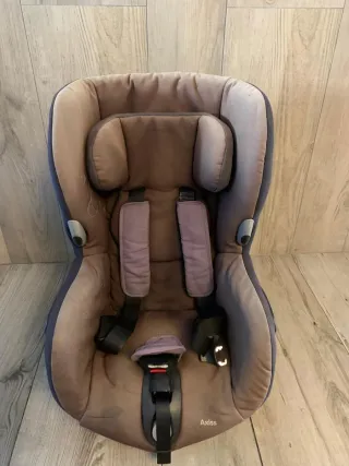 Silla de coche para grupo 1, marca Axiss. - Color marrón oscuro con detalles en gris y morado. - Acolchado para mayor comodidad. - Arnés de seguridad de 5 puntos.