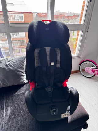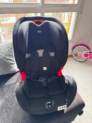 Silla de coche Chicco en color negro, con detalles en rojo y gris. - Diseño ergonómico. - Reposacabezas ajustable. - Fundas extraíbles para lavado. (se regala otra silla en mismo precio , esta muy bien solo que no tiene fundas)