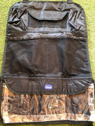 Soporte de plastico que se sujeta en la parte lateral del asiento trasero del coche y sirve para meter cosas necesarias de un bebe: toallitas, juguetes… esta nuevo sin estrenar. Marca Chicco.