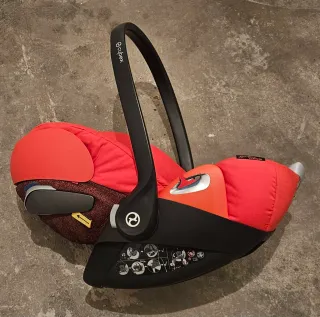 Silla de coche para bebé Cybex en color rojo. Diseñada para la seguridad y comodidad. - Asa de transporte negra. - Cinturones de seguridad de 5 puntos. - Logo de Cybex en el respaldo. - Tejido acolchado.
