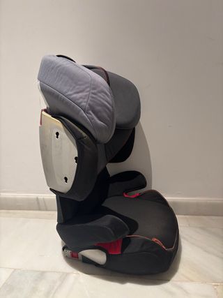Silla de coche de la marca Cybex, modelo Pallas 2-fix diseñada para la seguridad y comodidad de los más pequeños. La silla dispone de un cojín de seguridad delantero. - Tapicería en tonos grises, negros y rojos. - Reposacabezas ajustable. - Diseño ergonómico. Imperfecciones: - Pequeño descosido en el lateral de la funda del asiento