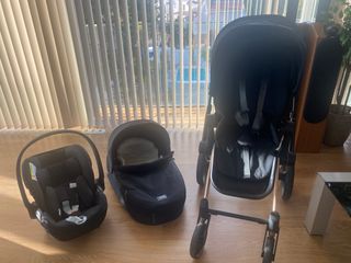 Se vende conjunto de carrito de bebé Cybex Priam de 3 piezas. - Incluye silla de paseo, capazo y silla de coche. - Color negro con detalles en oro rosa. - Capazo con interior acolchado. - Silla de coche con arnés de seguridad.
