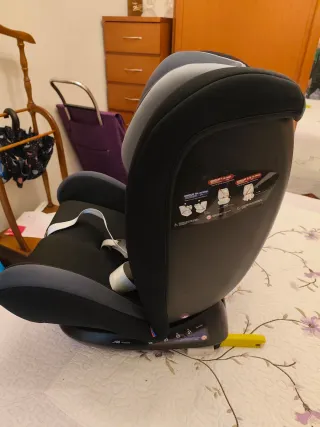 Silla de coche Milos, grupo 0/1/2/3, con base giratoria 360°. Completamente nueva, no ha sido usada porque fue un regalo para un segundo coche que no se ha usado. - Grupos 0/1/2/3 desde 40 hasta 150cm. - Base con rotación de 360 grados. - Sistema ISOFIX y cinturón Top Tether. - A contramarcha hasta los 18 kg (40 a 105 cm) y a favor de la marcha hasta los 36 kg (75 cm a 150 cm) aprox. - Se puede ir ajustando a la altura del niño gracias a sus 4 posiciones de reclinado y a sus 14 posiciones de cabezal. - Tejidos de máxima calidad, transpirables e incluyen reductores acolchados.