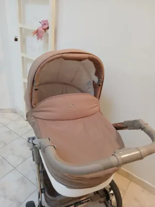 Conjunto de cochecito Kinderkraft con tres piezas para diferentes etapas. - Incluye capazo, silla de paseo y silla de coche Grupo 0. - Diseño moderno en color beige y negro. - Capazo con interior acolchado con ajuste de altura para la cabeza y capota regulable. - Silla de paseo con manillar ajustable. - Silla de coche con asa para transporte. -Sacos de invierno (regalo) a reparar botones.