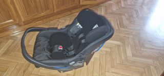 Silla grupo 0+ para coche con anclaje por cinturón de seguridad de tres puntos y en sentido contrario a la marcha, muy cómoda para transportar al bebé y además puede engancharse en la silla de paseo. Válida de 0 a 13 kg. Nueva cuesta 189€.