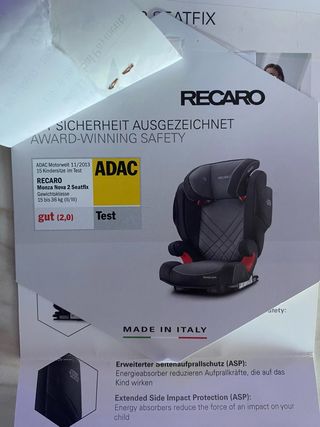 Silla de coche RECARO Monza Nova 2 Seatfix, galardonada con Award-Winning Safety por ADAC Motorwelt en 2013. Diseñada para niños de 15 a 36 kg (Grupo II/III). - Calificación gut (2,0) en test. - Protección ampliada contra impactos laterales (ASP). - Fabricada en Italia.