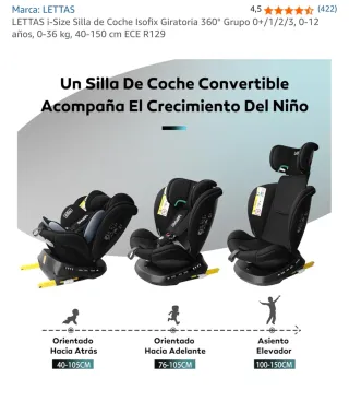 Silla de coche giratoria LETTAS i-Size, homologada bajo la normativa ECE R129. - Grupo 0+/1/2/3. - Peso: 0-36 kg. - Altura: 40-150 cm. - Isofix. - Giratoria 360°. Se vende porque se compró y no se le dio uso y necesitamos espacio
