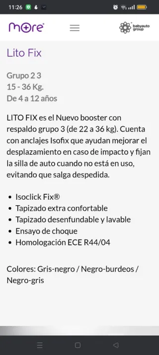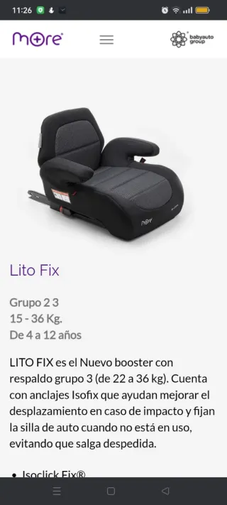 Silla de auto para niños, adaptable a diferentes etapas de crecimiento. - Diseño en color negro y gris. - Marca Babyauto. - Sistema ISOFIX. - Foam para grupo 1 incluido. (No aparece en las fotos).